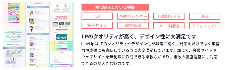LincUpはLPのクオリティやデザイン性が非常に高く、見栄えだけでなく集客力や成果にも直結している点に大変満足しています。加えて、会員サイトやウェブサイトを無制限に作成できる柔軟さがあり、複数の講座運営にも対応できるのが大きな魅力です。
