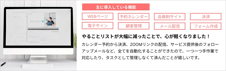 カレンダー予約から決済、ZOOMリンクの配信、サービス提供後のフォローアップメールなど、全てを自動化することができたので、一つ一つ手作業で対応したり、タスクとして管理しなくて済んだことが嬉しいです。