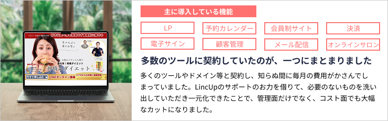 以前からオールインワンツールを利用していましたが、どれも帯に短し襷に長しで、結局は2種類を使い分けなければならず、効率の悪さに悩んでいました。そんな中で出会ったのがLincUpです。導入後は紹介制度を取り入れたことで集客や売上が大きく伸び、業務全体を一元的に管理できるようになりました。