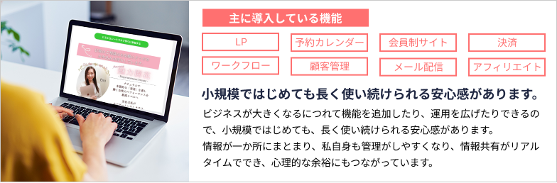 ビジネスが大きくなるにつれて機能を追加したり、運用を広げたりできるので、小規模ではじめても、長く使い続けられる安心感があります。