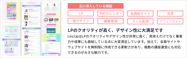 LincUpはLPのクオリティやデザイン性が非常に高く、見栄えだけでなく集客力や成果にも直結している点に大変満足しています。加えて、会員サイトやウェブサイトを無制限に作成できる柔軟さがあり、複数の講座運営にも対応できるのが大きな魅力です。