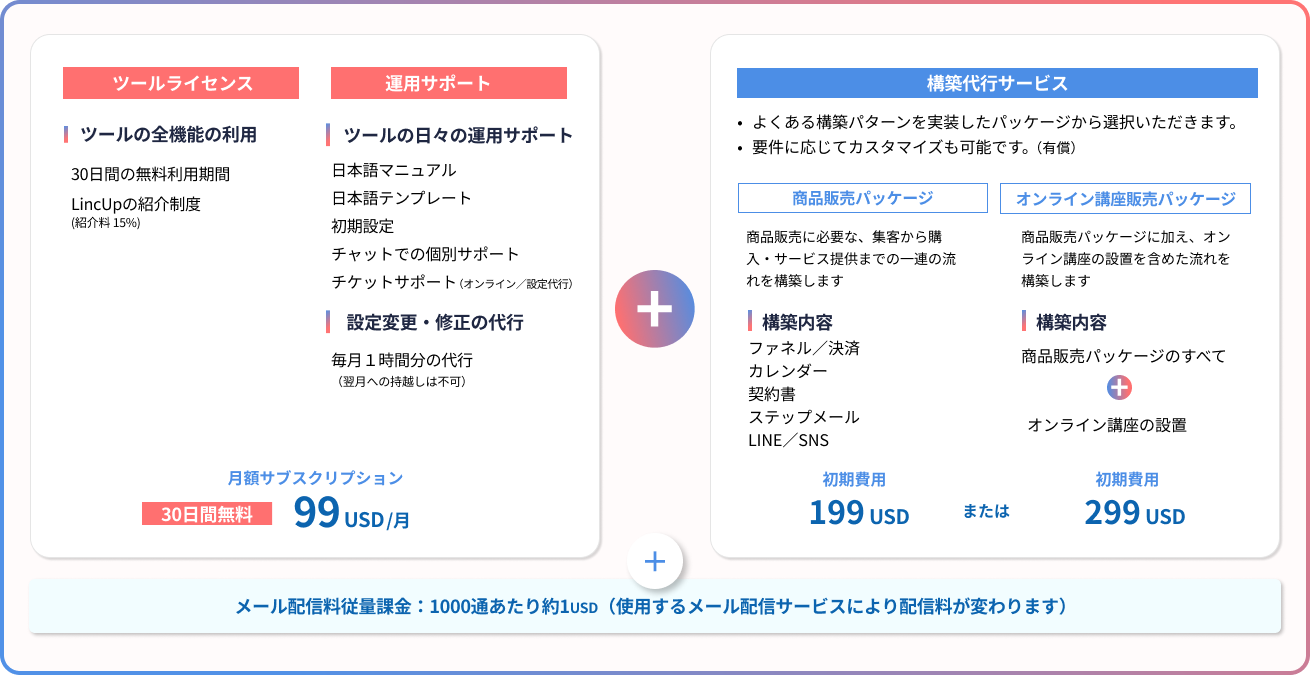 | LincUpアドオン | $5/月+従量課金* 初期設定、委託サービス、チャットやWeb会議での個別サポート |